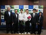 11月15日、ロボットコンテストで活躍した生徒たちによる町長への表敬訪問をさせていただきました。今年度のドラフトでソフトバンクに指名された都農町出身の河野伸一朗さんも表敬訪問をされており、一緒に写真撮影を行いました。また、坂田町長の前でロボットの実演を行い、お褒めの言葉や労いの言葉をいただきました。宮崎日日新聞社の取材もあり、新聞にも掲載されるそうです。