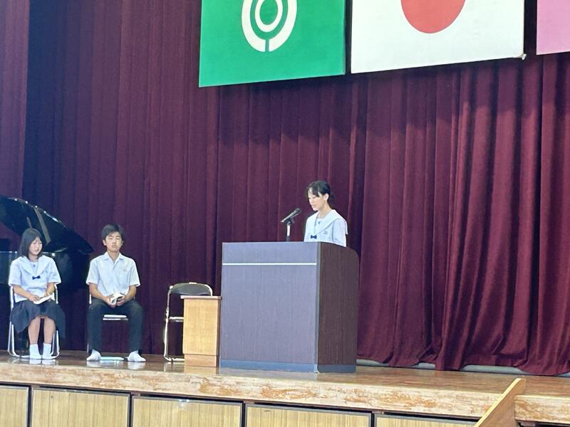 校長より一学期を振り返り、今後についての話の後、1・2・3年生の代表生徒が一学期の反省と今後の目標を堂々と述べました。