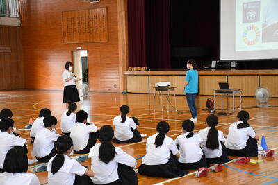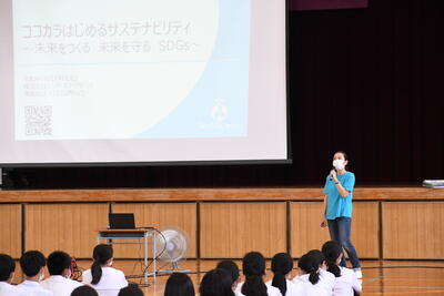6月24日(金)5・6校時、3年生対象にSDGsの講話とワークショップを開催しました。SDGs講話は、難波裕扶子氏(THINK of OTHERs代表)を招聘し、現代社会の諸課題の解決につながる最も大切な視点を教授してもらいました。難波氏を招聘するのは、本年度で3年目となり、本校の総合的な学習に時間を活用し、全学年が学習する機会をつくっています。
