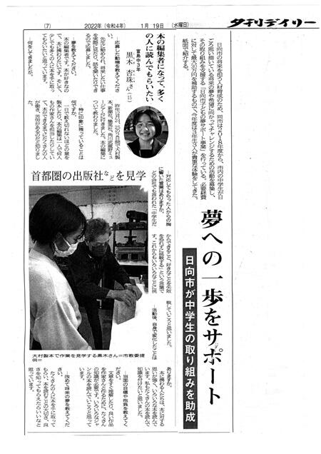 先日、1/19(水)の夕刊デーリーに、本校3年の黒木杏珠さんが「日向市子ども夢サポート事業」に応募し、年末に貴重な体験をしたことが紙面で紹介されました。