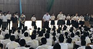 7月16日(火曜)から始まる県中学総体に、本校から12競技が出場します。各部のキャプテン等からの自信にあふれる頼もしい抱負の後、生徒代表の甲斐美化委員長から激励の言葉を受け、陸上部の柏田主将が出場選手を代表して選手宣誓を行いました。優勝、九州大会の切符をめざして、悔いの残らないように、力を出し切って来てください。