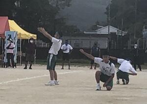 9/29(水)、本日から体育大会のための「全校体育」が始まりました。開会行事の礼の仕方の練習の途中に、残念ながら突然のスコールがあり、中断。雨が上がった後、退場の練習を行いました。