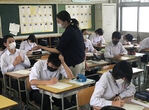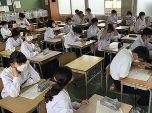 5/20、今日と明日の2日間、「第1回定期テスト」が実施されます。今年度、最初の定期テストですが、1年生にとっては初の定期テストとなります。また、下の受験風景は英語のテストで、これも初の英語のテストとなります。皆さんは2週間前から、テスト勉強計画を立て、この日に備えてきたと思います。明日まではテレビやスマホは我慢し、テスト勉強に取組みましょう。