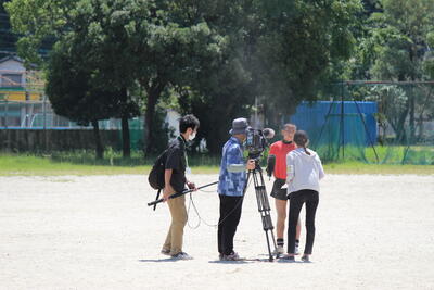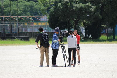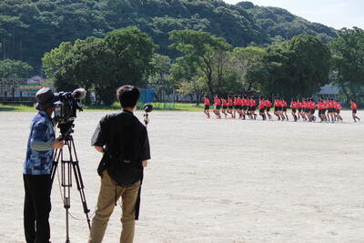 朝9時からの練習に合わせてテレビ局の方3名来校され、富島中生たちの練習風景を撮影してくれました。朝とはいえ、30℃を越える暑さの中、汗を流す生徒たちのようすを3時間みっちり取材。最後に、キャプテン田中勝斗くんをはじめ、代表者がインタビューに答えていました。この模様は、8月22日(月)の夕方6時からのMRTニュースで放送されるようです。