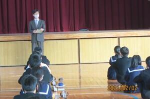 1/6(水)、3学期の初日、県内でもコロナの感染拡大が進んでいることもあり、またしても「始業式を放送で」行いました。学年代表が、しっかり新年の抱負を発表してくれました。年代わりの節目です。竹のようにしっかりした節をもち、しなやかで折れないようなれるように努めましょう。