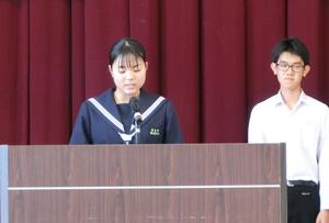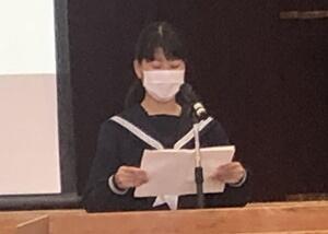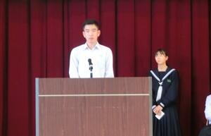 感謝状を授与、学校長の感謝のことばの後、今回退任する生徒会役員、専門委員長が最後のあいさつをしていきました。コロナ禍での生徒会活動で思い描いたこともできなかったりと苦労した役員でした。お疲れさまでした。