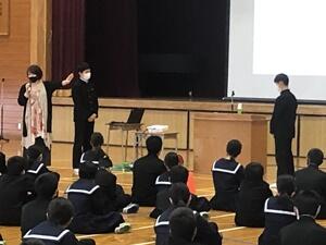 11/27(木)、「芸術鑑賞教室」を実施しました。今年度は、宮崎県護国神社の「宮崎雅楽会」の方をお呼びし、古典音楽の「雅楽」を鑑賞しました。コロナの影響もあり学年ごと3講演していただき、普段見ることがないので興味津々見入ってました。
