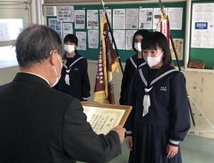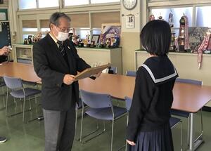 12/15(火)、日向地区保護司会の会長が来校され、「社会を明るくする運動作文コンテスト」において入賞した本校3名の表彰式を実施しました。