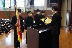12/24(金)は、2学期終業の日。体育館で「終業式」を実施しました。まず、各学年の代表(1年2年3年)に2学期を振り返って発表をしてもらい、続いて学校長がコロナの1年を振り返りました。終了後、各種表彰を行い、2学期を締めくくりました。
