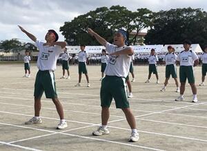 10/8(金)、体育大会前日です。明日の天気が心配されますが、最後の全体練習が行われ、各団長からあいさつがありました。