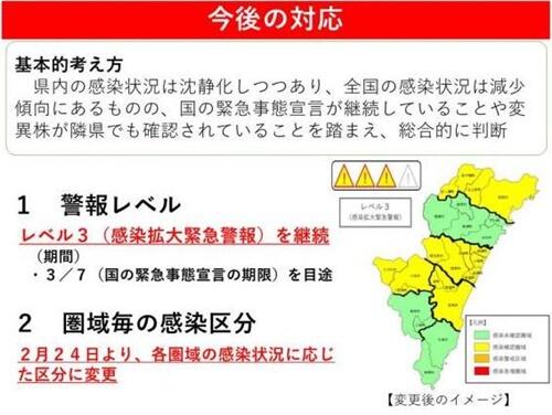 県は22日、新型コロナウイルスの感染拡大に伴い県内全域に発令している県独自の警報レベル「3」の感染拡大緊急警報を、国の緊急事態宣言の期限である3月7日まで継続すると発表しました。