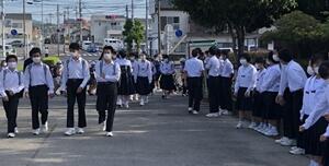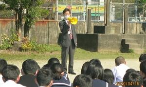 4/16(木)、地震及び津波を想定した避難訓練を実施しました。グラウンドに1次避難をした後、1年生と転入職員は津波の時の2次避難場所、日知屋公民館前の高台を確認しました。1次避難の際、真剣さが足らなかったことと、最も重要な避難時間が4分もかかったこと(昨年度は3分20秒)が課題として残りました。これは、命に係わることですので、意識を高めさせていきたいと思います。