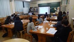 11月13日(水)、富島中学校区の小中学校4校の全教員が集まっての研修会を、本校を会場に実施しました。午後の清掃と5校時の授業を参観してもらいました。生徒は小学校の先生にいい所や成長ぶりを見せようと、いつもに増して積極的でした。小学校の教員も自分の教え子の成長を確かめることができ喜んでいたようです。その後、「知」「徳」「体」の3部会で、小中学校で連携、継続しててきる「授業の受け方」「春休みの課題」「スマホの使い方」「体育の指導」のことなどについて協議を深めました。
