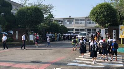 7月1日(月曜)、雨の中、第1学年PTAの「朝のあいさつ運動」が始まりました。普段の生徒会、教員、更にそれにPLUSして、この日は「細島まちづくり協議会」の皆さんも参加していただき、雨に負けない明るい、活気あるあいさつ運動になりました。