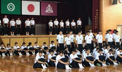 始業式では、2学期の目標を、学年代表として行實くん(1年)、石原さん(2年)、池田さん(3年)の3名が、「忘れ物をしない」「早寝早起き、朝学習にチャレンジ」「意味のある勉強をする」などの発表してくれました。
