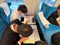 新幹線内で平和学習の振り返り学習を行っています。