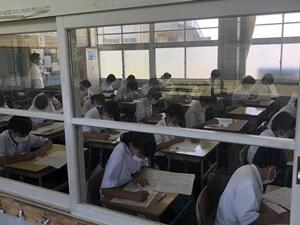 7/2(木)、今年度「初の定期テスト」を実施しました。4月~5月にかけて臨時休業が続いたことから、「中間テスト」を中止にしましたので、1年生にとっては「初」となりました。高校受験に対応したテストの受け方に、事前に説明はあったものの慣れないこともあり、「机の中に教科書等を入れる」「「はじめ」のあいさつの前に始める」など、いろいろなことがあったようです。テストは明日まで続きます。エアコンもあり環境は整っています。頑張ってください。