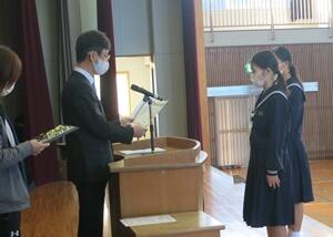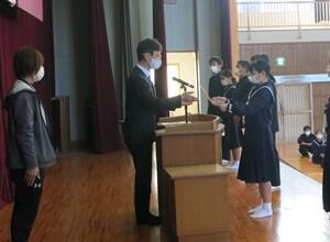 12/8(火)、全校集会で県秋季体育大会や県サイエンスコンクール等の表彰を行いました。今回の表彰は、次のとおりです。