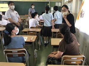 7/12(月)の放課後、本校で「日向高校F(フロンティア)科説明会」が実施されました。希望する生徒・保護者15名程度は高校生が行う学校説明のプレゼンを真剣に聞いていました。その後小グループでの座談会が開かれ、生徒は高校生に素朴な質問をぶつけていました。