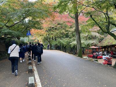 奈良公園内の紅葉を散策しながら、昼食です。朝早かったので、みんなモリモリ食べています。