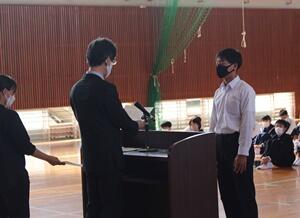 また、新任式では、先の生徒会役員選挙の当選者が、互選により生徒会長以下任命されました。続いて全校専門正副委員長を委嘱しまし、R3-R4の生徒会執行部が整いました。それぞれの選挙公約を実現するために力を合わせて頑張ってください。