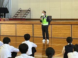避難後、学校に戻り体育館で今回の避難訓練の様子を見学していただいた防災士の黒木邦寛さんと黒木茂紀さんから話をしていただきました。