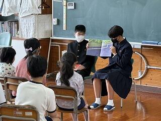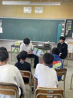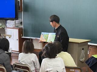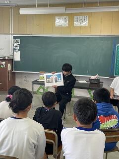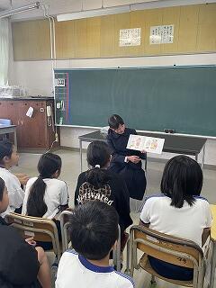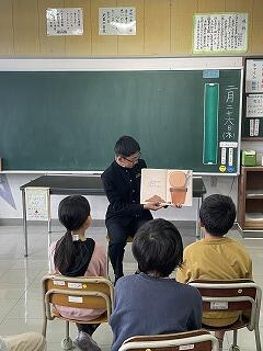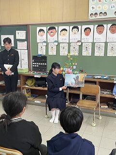 2年生の読み聞かせを海野千浪さんが「たからのあじはまだにがい」、河野千秋さんが「おにがきた」「てぶくろ」