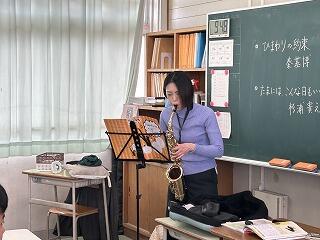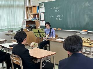 〇3年生の理科の最後の授業がありました。今回の授業は、音の復習ということで、ギターの音の高さの違い、木管楽器(サックス)の音の高さの違いについて勉強しました。
