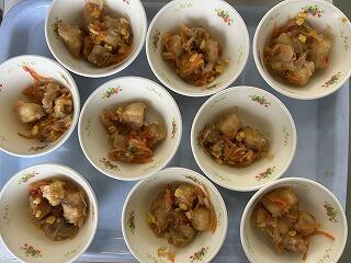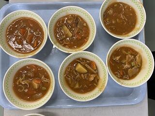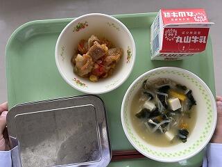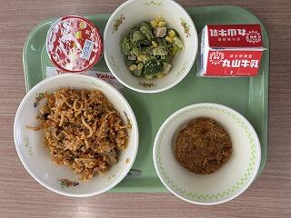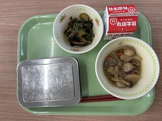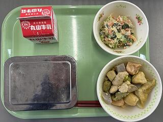 〇麦ご飯、カレーおでん、こまツナのあえもの