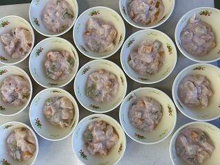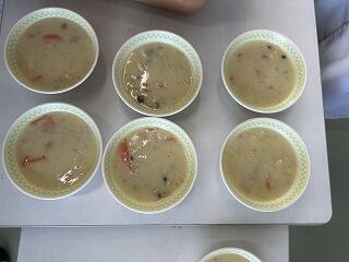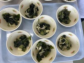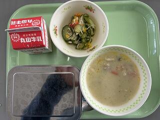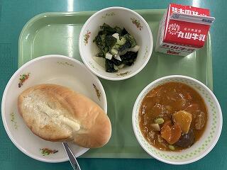 〇マヨネーズパン、さつまいもとまいたけのシチュー、わかめサラダ