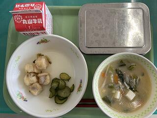 〇26日が、麦ご飯、魚のネギソース、そえ野菜、たんたんスープ