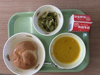〇こめこパン、カボチャのクリーム煮、ゆずドレッシングサラダ