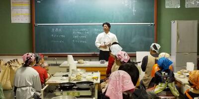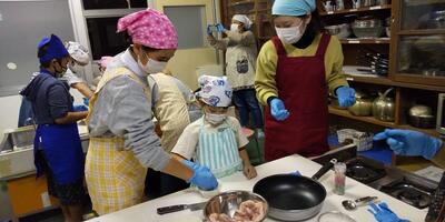 鶏肉料理の下処理の仕方、にんにくとオリーブオイルの香りの出し方、フライパンで肉を焼く時の火の加減、きのこの切り方と生クリーム等の味付け方等、プロならでは「こつ」を伝授していただきました。調理するときは、真剣そのものでしたが、試食するときは、笑顔いっぱいでした。食に感謝です。