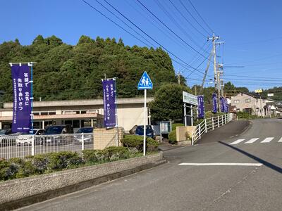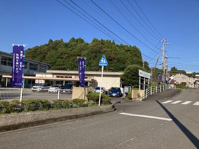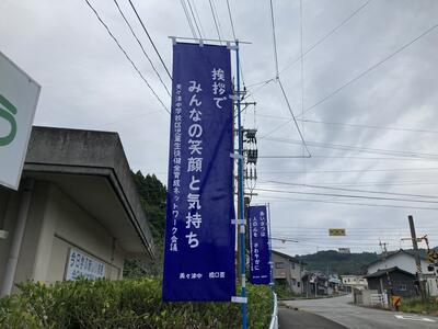 のぼり旗は、本ネットワーク会議が1学期末に、美々津中校区内の小中学生に「あいさつ運動の標語」を募集し、3校(美々津小・寺迫小・美々津中)からそれぞれ2作品選出したものです。合計6作品を3校にそれぞれ配付し、校門付近に掲げています。
