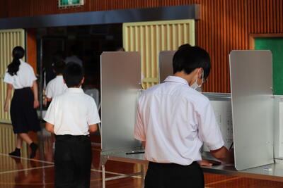 した。校長先生の話の中に、投票するという行動は、『民主主義』を実践する上で最も大切な行動だという話がありました。3年生はあと3年経つと選挙権が与えられます。ぜひ、社会に出てもその大切さが実践できるよう学べる機会になるといいですね。