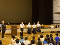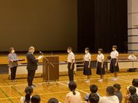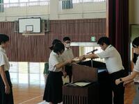7月21日(金)、1学期の終業式が行われました。式では、1学期の反省 を1年生 小田さくらさん、2年生 河野澪奈さん、3年生 黒木竣介さ んがそれぞれ発表してくれました。