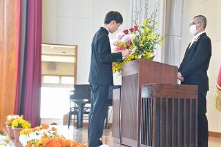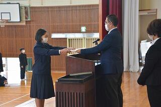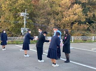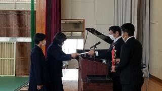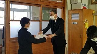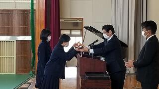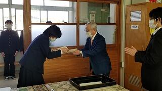 6月24日(金)に日向東ロータリークラブの会長 江川昌義 様、幹事 三樹 賢一郎 様、次年度会長 岡田 基継 様が来校され「鮫島哲也賞」の授与式が行われました。昨年度の美々津中学校の『いじめの未然防止に関する取組』が評価されました。今年度も継続して【やさしい言葉の花】の制作活動を行っていきます。