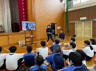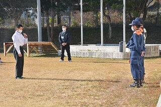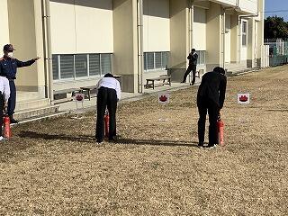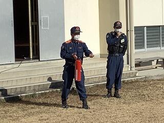 し、放送の指示で学級担任が誘導し、運動場へ避難しました。避難後は、消火器を使った実演を交えての消火方