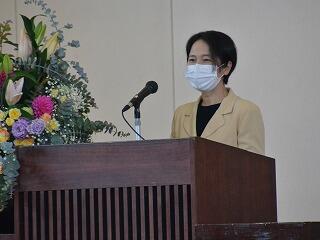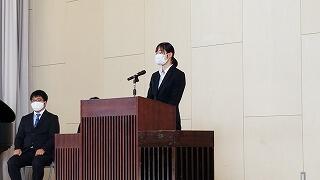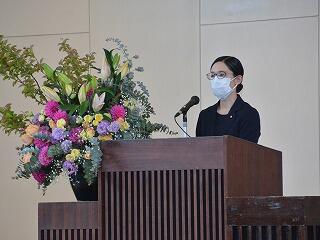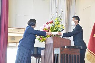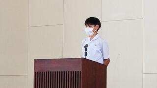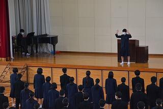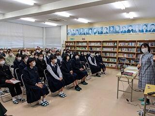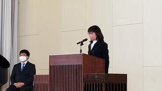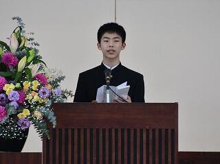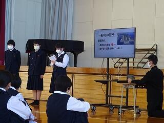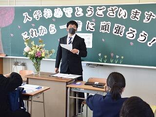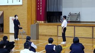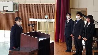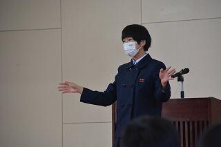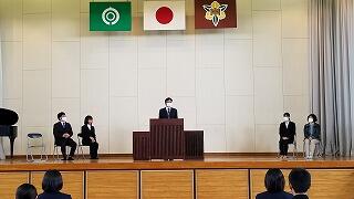 その後に、英語暗唱弁論の発表、先輩の声を聞く会、学習面・保健面・生活面について各担当の先生からの話、容儀検査を行いました。今年度の「先輩の声を聞く会」はコロナ対策のために、あらかじめ撮影しておいた映像を映写して行いました。協力していただいた高校3年生の皆さんありがとうございました。