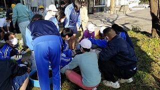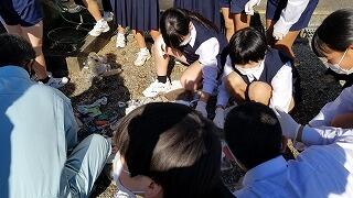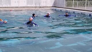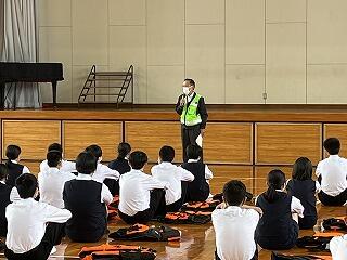 7月14日(木)6校時の体育(水泳)で「着衣水泳」を行いました。日常の生活で遊んでいる時に、海や川に落ちた時のことを想定して、学校指定のジャージ上下を着て、体育館シューズを履いて、プールに飛び込みました。水着で泳ぐ時と違って、体が重く、思うように泳げない体験ができました。空のペットボトル1つあると非常に浮きやすい体験や、おぼれた人を助けるための「ヒューマンロープ」なども実践しました。ライフジャケットを着用すると非常に浮きやすいことも実感しました。