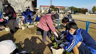 「花いっぱい運動」を行いました。高齢者や6年生とのふれ合いで豊かな心を育むとともに、母校に貢献す