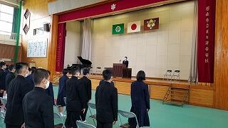 令和4年8月26日(金)始業の日でした。大清掃の後、体育館にて始業式を、窓を全開にして換気し、生徒一人一人の間隔を広げて座り、全員マスク着用で実施しました。もちろん入館時には手指のアルコール消毒を行い、新型コロナウイルス感染症対策を徹底しています。各学年の代表生徒の2学期の抱負、校長先生の話、校歌斉唱、表彰を行いました。