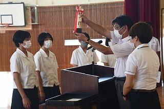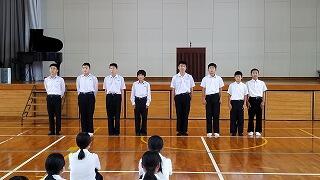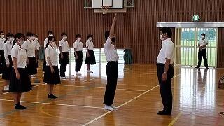 7月15日(金)6校時に推戴式を行いました。いよいよ明日から県大会です。地区大会で女子ソフトテニス部個人戦ベスト4の村上陽彩さんと是則わかなさんペア、男子卓球個人戦ベスト4の橋本暁弥さんが地区代表として出場します。校長先生やキャプテン会会長の黒木さくらさんの激励の言葉とともに全校生徒、全職員がエールを送りました。