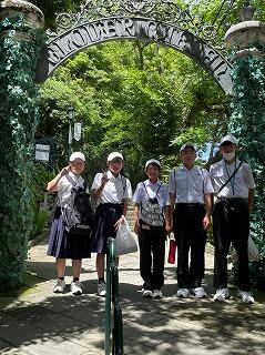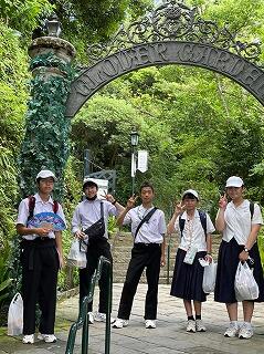 7月7日(木)修学旅行2日目です。ホテルで朝食を済ませると、さっそく長崎市内の班別自主研修がスタートしました。事前に各グループで考えたコースをたどり、グラバー園を経由してゴールのオランダ物産館を目指します。昼食を取ったら、ハウステンボスへ出発です。今夜泊まるホテルは「変なホテル」!