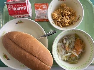 〇ドッグパン、ミルメーク、スクランブルエッグサンド、ラビオリのスープ