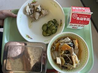 〇麦ご飯、鶏肉の甘酢あんかけ、中華和え、キムチチゲ