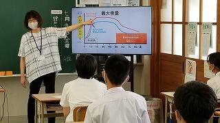 の授業)」を行いました。第1学年は「成長期の食事」、第2学年は「部活動生のからだづくり」、第3学年は