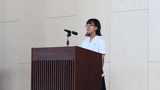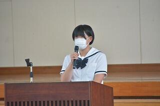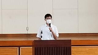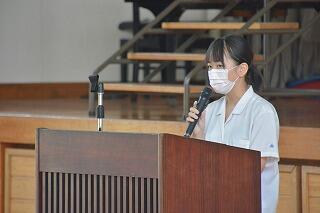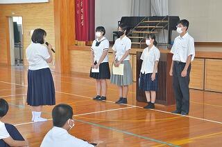 をカットする等、時間を短縮しての始業式を実施しました。各学年代表生徒が元気に2学期の豊富を述べました。