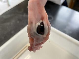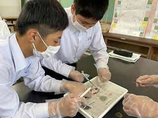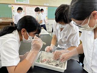 6月14日(火)4校時の理科の授業で、豚の眼球を使った解剖実験が行われました。外観の様子を観察した後、解剖してレンズ(水晶体)を取り出し、網膜や視神経の様子を観察しました。その他にも肺や心臓、小腸、肝臓、腎臓も本物の臓器を手で触って観察を行いました。