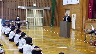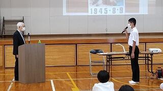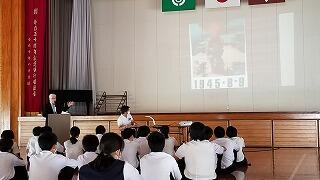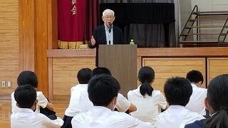 6月21日(火)5・6校時に「被爆体験講話」を実施しました。日向市が推進している事業で、将来を担う子どもたちに、原爆の恐ろしさや戦争の惨禍を直に伝え、世界恒久平和の尊さを学習することをねらいとしています。本日は長崎県から(公財)長崎平和推進協会 継承部会員の丸田 和男(まるた かずお)さんに来ていただきました。丸田さんは、中学1年生(13歳)のときに自宅で被爆され、倒壊した家の下敷きとなり、重傷を負いながらも助かりました。母親は死亡。中学校の同期生300人中約100人が原爆の犠牲となりました。現在も後頭部から背中にかけて、約50箇所のガラス傷が残っているそうです。子どもたちは、真剣な態度でしっかりと話を聴き、このようなことが二度とあってはいけないと強く感じることができました。